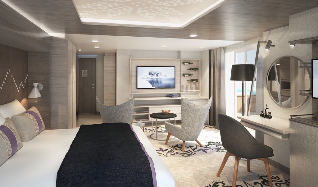 Suites with private balcony, different sizes, top-high decks, flexible sleeping arrangements, some with sofabed, TV, minibar, bathrobe, kettle, tea and coffee, espresso maker. The first minibar setup is included for each item, each replenishment is chargeable.Please note: This cabin is automatically made with a double bed. To order twin beds, please notify us at time of booking.