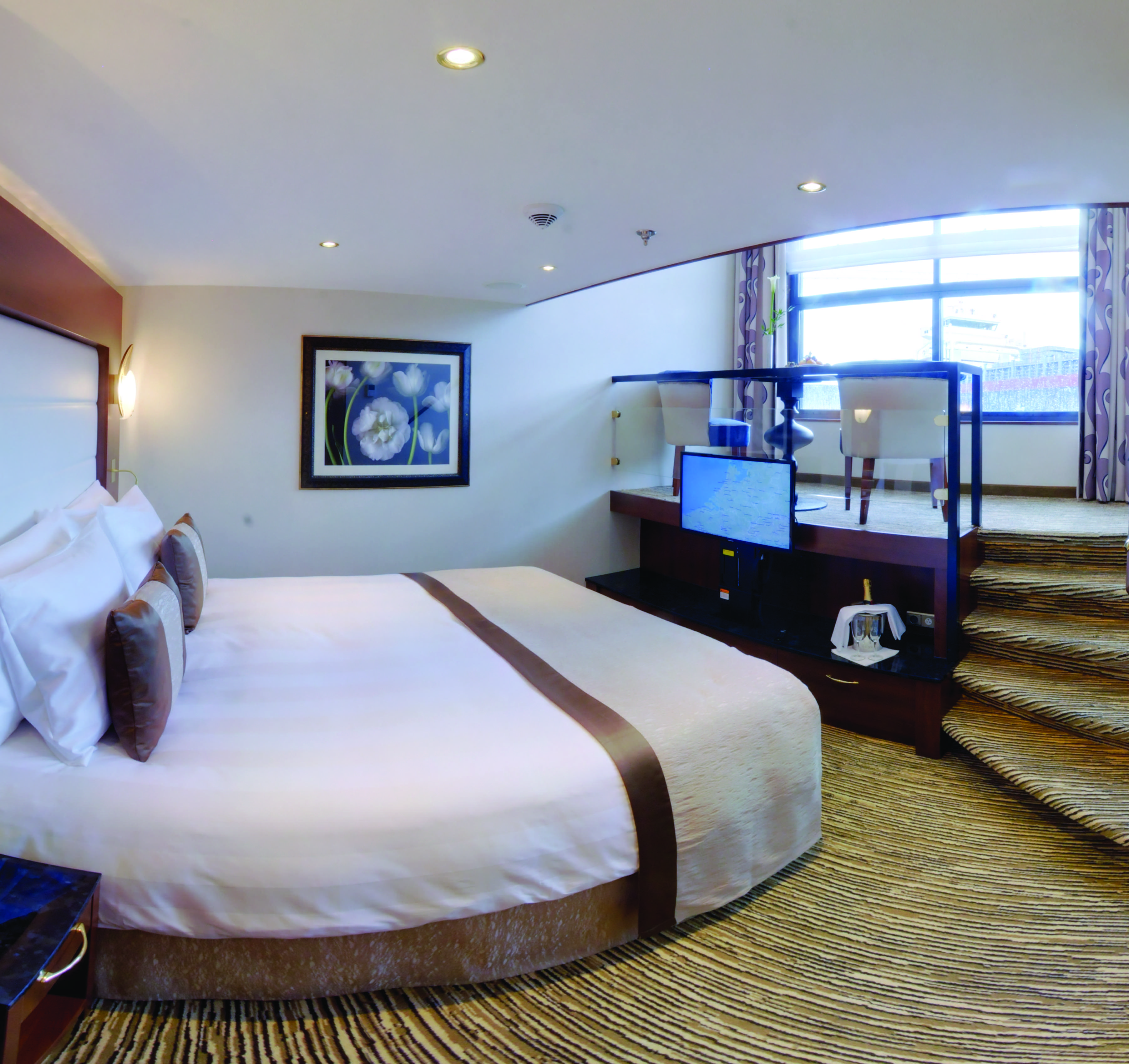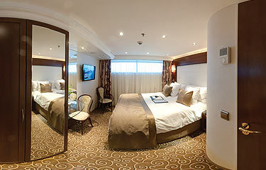 The spacious Panorama Lounge in the bow, with its bar, dance floor and entertainment, is a delightful gathering spot in the evenings.