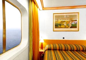 Picture window, two lower beds that can convert to queen size. Direct dial, ship-to-shore telephone service, television, hair dryer, safe deposit box and mini-bar in every stateroom.
