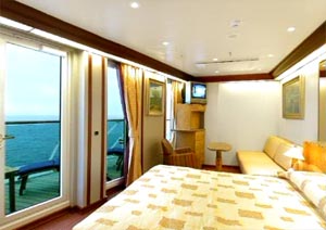 Oceanview with veranda balcony, two lower beds that can convert to queen size, whirlpool bath, shower and sitting area. Direct dial, ship-to-shore telephone service, television, hair dryer, safe deposit box and mini-bar in every stateroom.