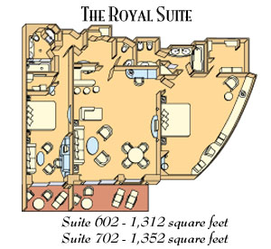 Stately describes the Royal Suite, commanding and majestic. Perfect for entertaining with enough living space to roam. The pinnacle of good living. The Royal Suites are available as a one-bedroom configuration or as two-bedrooms by adjoining with a Veranda Suite.Suites are fitted with a large teak veranda, complete with patio furniture and floor-to-ceiling glass doors. The living room comes with a sitting area, however there is also a separate dining area and a bar. Suites have a choice of twin beds or a queen-sized bed and the second bedroom also has an additional sitting area for guests. Owners suites have marbled bathrooms with double vanity, separate shower and full-sized whirlpool tub, plus a powder room- the second bedroom is also equipped with a marbled bathroom with full-sized bath. A walk-in wardrobe with personal safe is provided along with a Radio/alarm with iPod docking station, Direct-dial telephone, refrigerator and bar setup, stocked with your preferences, Pratesi® fine bed linens and down duvet covers, premium mattresses and a choice of pillows, Plush robes and slippers, choice of European bath amenities, vanity table(s) with hair dryer, writing desk(s) with personalised stationery, binoculars, and umbrella, WiFi access, flat screen TV(s), on-demand movies, and satellite news, and dry cleaning and pressing service (fee applies).