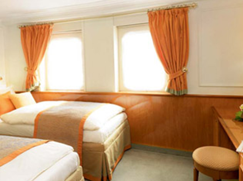 #18-25 — These cabins have two single beds, panorama window, dressing table, and efficient bathrooms with showers, marble sink, and gold-plated fixtures. They have telephones, temperature controls, a minibar, and a small safe.